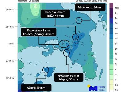 Στον σχετικό χάρτη, αποτυπώνονται τα αθροιστικά ύψη βροχόπτωσης έως τις 9:00 το πρωί, όπως αυτά καταγράφηκαν από 101 μετεωρολογικούς σταθμούς του Εθνικού Αστεροσκοπείου Αθηνών/meteo.gr στην ευρύτερη περιοχή Αττικής Βοιωτίας και Εύβοιας.