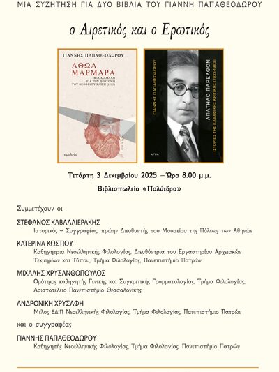 Εκδήλωση – συζήτηση για δύο βιβλία του συγγραφέα και πανεπιστημιακού καθηγητή Γιάννη Παπαθεοδώρου, θα λάβει χώρα στο Βιβλιοπωλείο «Πολύεδρο», στην οδό Κανακάρη 147 στην Πάτρα την Τετάρτη 3 Δεκεμβρίου 2025, στις 8.00 μ.μ.