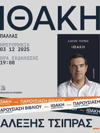 Η παρουσίαση του βιβλίου «Ιθάκη» του Αλέξη Τσίπρα από τις εκδόσεις Gutenberg θα πραγματοποιηθεί την Τετάρτη 3 Δεκεμβρίου στο Θέατρο Παλλάς.