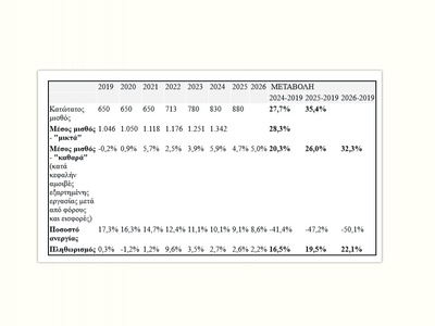 Σύμφωνα με τα στοιχεία του ΠΔΠ, σε σχέση με φέτος, το 2026 αναμένεται αύξηση 5% στις «καθαρές» από φόρους και εισφορές μέσες αμοιβές εξαρτημένης εργασίας, σε σχέση με το 2025, άνοδος υπερδιπλάσια από την αύξηση του πληθωρισμού που αναμένεται να μην ξεπεράσει το 2,2%