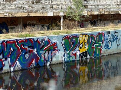 Σε έναν χώρο που έχει προ πολλού πάψει να θυμίζει αθλητική εγκατάσταση, κάποιοι αφιέρωσαν χρόνο, χρώμα και φαντασία, δημιουργώντας σχέδια και μορφές σε κάθε διαθέσιμη επιφάνεια. Εκεί όπου πλέον λιμνάζουν βρώμικα νερά και ανάμεσα σε σπασμένα πλακάκια φυτρώνουν καλάμια και χόρτα, τα νέα αυτά οπτικά ίχνη μοιάζουν σχεδόν να επαναδιεκδικούν τον χώρο.