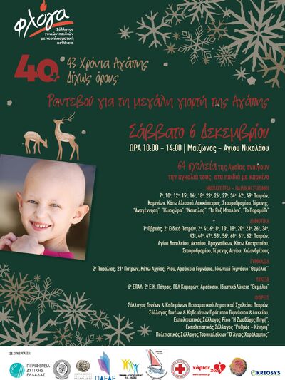 Οι μαθητές & οι μαθήτριες, οι εκπαιδευτικοί, οι Σύλλογοι Γονέων και Κηδεμόνων 64 σχολείων της Αχαΐας και το Παράρτημα Πάτρας του Συλλόγου Γονιών Παιδιών με Νεοπλασματική Ασθένεια «Φλόγα» προσκαλούν τον κόσμο αυτό το Σάββατο 6 Δεκεμβρίου 2025, ώρα:10.00 το πρωί, στην ξεχωριστή Χριστουγεννιάτικη γιορτή που αποτελεί πλέον θεσμό για την Πάτρα, στον πεζόδρομο Μαιζώνος και Αγίου Νικολάου.