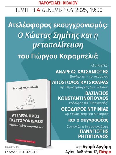 Στην Πάτρα παρουσιάζεται το βιβλίο «Ατελέσφορος εκσυγχρονισμός, ο Κώστας Σημίτης και η εποχή του», με σημαντικούς ομιλητές από τον πολιτικό, επιστημονικό και ακαδημαϊκό χώρο.