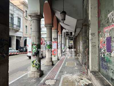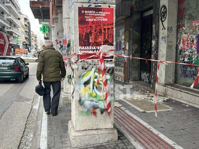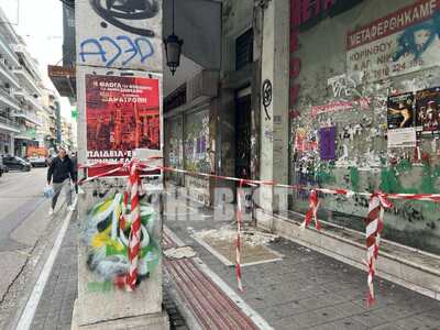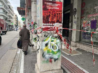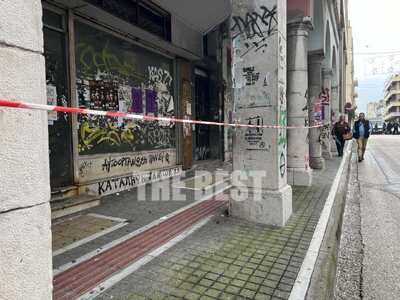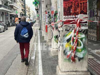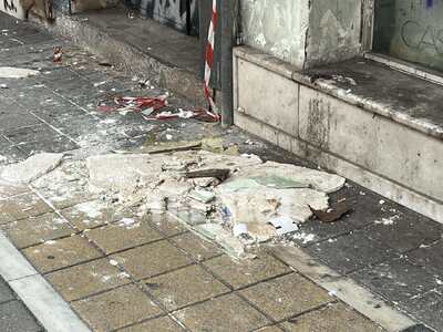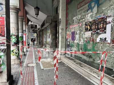 Το πεζοδρόμιο έχει αποκλειστεί με κορδέλες από την Αστυνομία, ύστερα από την κατάρρευση τμήματος της οροφής παλιού, εγκαταλελειμμένου κτιρίου, πριν περίπου ένα μήνα, με αποτέλεσμα οι διερχόμενοι να μην έχουν άλλη επιλογή από το να κατέβουν στον δρόμο.