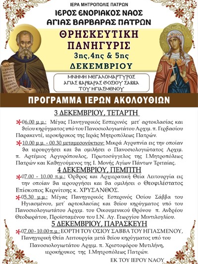 Τριήμερη Θρησκευτική Πανήγυρη για την Εορτή της Αγίας Βαρβάρας και του Οσίου Σάββα του Ηγιασμένου έχει η ενορία του Ιερού Ναού Αγίας Βαρβάρας Πατρών στην οδό Σολωμού.