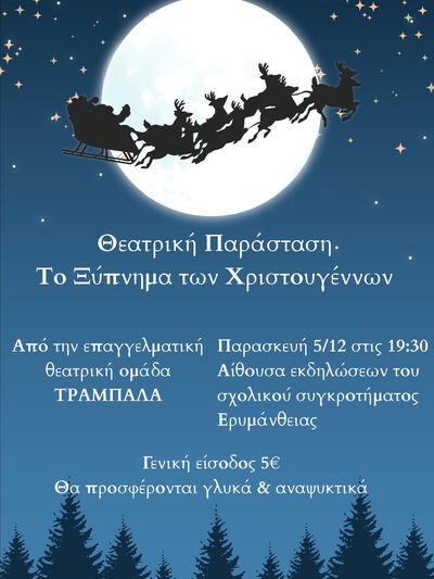 «Το Ξύπνημα των Χριστουγέννων», τιτλοφορείται η γιορτινή, χριστουγεννιάτικη παράσταση από τον Πολιτιστικό Σύλλογο Ερυμάνθειας και τη θεατρική ομάδα Τραμπάλα που έχει ετοιμαστεί & θα παρουσιαστεί σήμερα Παρασκευή.