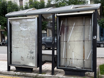 Για τουλάχιστον μια δεκαετία η διαφημιστική αυτή φωτιζόμενη πινακίδα στέκει με γυμνά καλώδια και σπασμένες λάμπες φθορίου, εκτεθειμένες μπροστά από τον ΟΣΕ της Πάτρας. Πρόκειται για χώρο που προοριζόταν για διαφημιστική προβολή μπροστά από το σταθμό του προαστιακού της Πάτρας, όμως από τότε που βανδαλίστηκε έμεινε σε αυτή την κατάσταση και κανείς δεν έχει επέμβει για να επαναφέρει έστω την αισθητική στη στάση.
