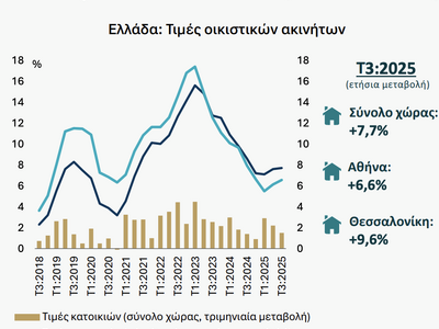 Για το τρίτο τρίμηνο του 2025, η μέση τιμή των κατοικιών στο σύνολο της χώρας, με βάση τα στοιχεία που δημοσιεύθηκαν από την ΤτΕ, κατέγραψε «επιταχυνόμενη», όπως τη χαρακτηρίζει η Εθνική Τράπεζα, αύξηση +7,7% ετησίως από το ανοδικά αναθεωρημένο +7,4% του πρώτου εξαμήνου του τρέχοντος έτους, «με επιβράδυνση ωστόσο της τριμηνιαίας μεταβολής στο +1,5% το τρίτο τρίμηνο από 2,6% κατά μέσο όρο το πρώτο εξάμηνο. Η μέση ανατίμηση στο εννιάμηνο διαμορφώθηκε στο +7,5% ετησίως από +9,8% το εννιάμηνο του 2024 και +9,1% για το σύνολο του 2024».