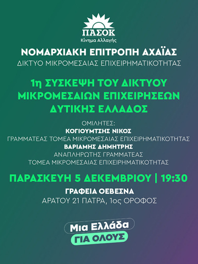 "Κάνουμε ανοιχτό κάλεσμα σε όλους τους μικρομεσαίους επιχειρηματίες να παρακολουθήσουν από κοντά την πρώτη συνάντηση όλων των ελεύθερων επαγγελματιών που συστήνουν το δίκτυο μικρομεσαίας επιχειρηματικότητας Νομού Αχαΐας για το ΠΑΣΟΚ" αναφέρει η ανακοίνωση.