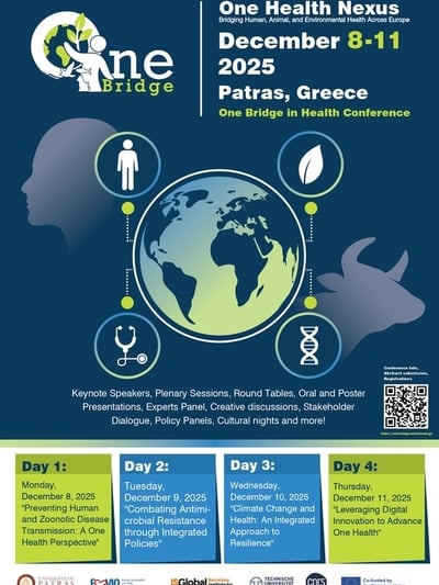 Το Εργαστήριο Υγιεινής, Επιδημιολογίας και Ποιότητας Ζωής της Ιατρικής Σχολής του Πανεπιστημίου Πατρών, υπό την επιστημονική ευθύνη του καθ. Απόστολου Βανταράκη, διοργανώνει από σήμερα, 8 έως τις 11 Δεκεμβρίου 2025, το Διεθνές Συνέδριο ONE-Bridge in Health στο Συνεδριακό και Πολιτιστικό Κέντρο του Πανεπιστημίου Πατρών, στο πλαίσιο του ευρωπαϊκού έργου EU4Health – One Health Nexus: Bridging Human, Animal & Environmental Health Across Europe.