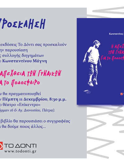 Τη συλλογή διηγημάτων του δημοσιογράφου και συγγραφέα Κωνσταντίνου Μάγνη με τίτλο «Η απέχθεια των γυναικών για το ποδόσφαιρο» παρουσιάζουν σε εκδήλωση οι εκδόσεις Το Δόντι την Πέμπτη 11 Δεκεμβρίου 2025, στις 8:30 μ.μ. στο θέατρο «Επίκεντρο» (οδός Νόρμαν 16 & Αγ. Διονυσίου), στην Πάτρα.
