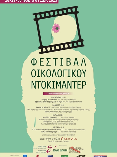 Το 1ο Φεστιβάλ Οικολογικού Ντοκιμαντέρ Ελευσίνας ολοκληρώθηκε με επιτυχία, εγκαινιάζοντας έναν νέο θεσμό που συνδέει την κινηματογραφική δημιουργία με τον σύγχρονο περιβαλλοντικό προβληματισμό. Για τέσσερις ημέρες (28/11 με 1/12/2025), το ιστορικό Σινέ Ελευσίς φιλοξένησε ελληνικά και διεθνή ντοκιμαντέρ που άνοιξαν έναν ζωντανό διάλογο για τη φύση, την ανθεκτικότητα των κοινοτήτων και τη σχέση ανθρώπου-περιβάλλοντος.