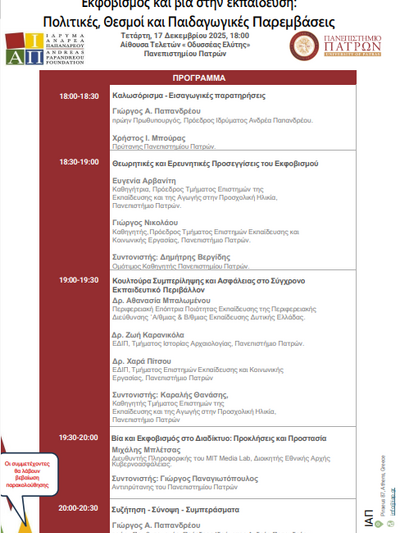 Την Τετάρτη 17 Δεκεμβρίου 2025 και ώρα 18:00, στην Αίθουσα Τελετών « Οδυσσέας Ελύτης» του Πανεπιστημίου Πατρών, το Ίδρυμα Ανδρέα Παπανδρέου σε συνεργασία με το Πανεπιστήμιο Πατρών, διοργανώνουν ημερίδα με θέμα: "Εκφοβισμός και βία στην Εκπαίδευση: Πολιτικές, Θεσμοί και Παιδαγωγικές Παρεμβάσεις".