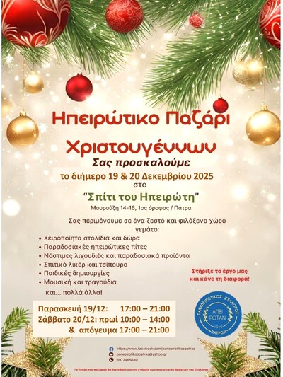 Ο Πανηπειρωτικός Σύλλογος Πατρών και η Εφορία Κυριών προσκαλούν το κοινό της Πάτρας το διήμερο 19 & 20 Δεκεμβρίου 2025 να τιμήσει με την παρουσία του το καθιερωμένο «Ηπειρώτικο Παζάρι Χριστουγέννων», μια εκδήλωση που έχει αγαπηθεί και πλέον αποτελεί θεσμό και πολύτιμο κομμάτι της πολιτιστικής ζωής της πόλης μας.
