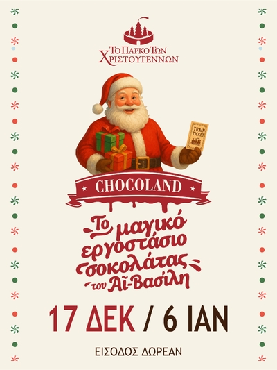 Από τις 17 Δεκεμβρίου έως και τις 6 Ιανουαρίου, η Chocoland – Το Μαγικό Εργοστάσιο Σοκολάτας του Αϊ -Βασίλη, ανοίγει τις πύλες της και προσκαλεί μικρούς και μεγάλους σε ένα μοναδικό γιορτινό ταξίδι, όπου η φαντασία, η χαρά και το άρωμα της σοκολάτας πρωταγωνιστούν.