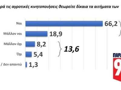 Συγκεκριμένα, δίκαια χαρακτηρίζει τα αιτήματα του αγροτικού κόσμου το 85,1% των ερωτηθέντων, ενώ το 64,8% δικαιολογεί τη μορφή των κινητοποιήσεων.