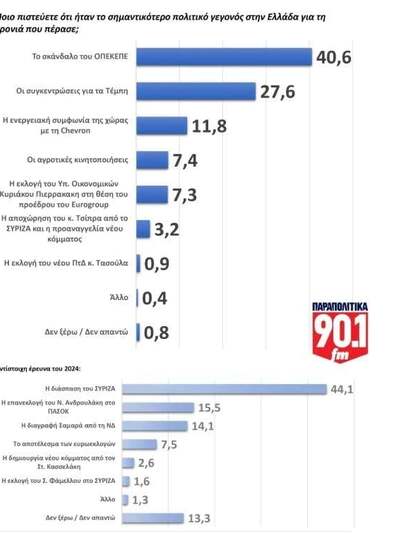 Το σκάνδαλο του ΟΠΕΚΕΠΕ, ως πολύ σοβαρό και πολύ φρέσκο με τις εξελίξεις να είναι καθημερινές και να απογοητεύουν τους πολίτες, χαρακτηρίζεται ως το σημαντικότερο πολιτικό γεγονός της χρονιάς που ολοκληρώνεται με 40,6%, ενώ ακολουθούν οι μεγάλες συγκεντρώσεις της 28ης Φεβρουαρίου για τα Τέμπη.
