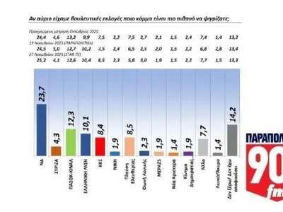 Η Νέα Δημοκρατία διατηρεί το άνετο προβάδισμά της στην πρόθεση ψήφου, ωστόσο το ποσοστό της υποχώρησε από το 25,2% του Νοέμβρη στο 23,7%. Δεύτερο κόμμα είναι το ΠΑΣΟΚ με 12,3%, τρίτο με 10,1% η Ελληνική Λύση, ενώ σημαντική άνοδο καταγράφει η Πλεύση Ελευθερίας (στο 8,5% από το 5,8%), χάρη και στη δυναμική παρουσία της Ζωής Κωνσταντοπούλου στην Εξεταστική Επιτροπή.