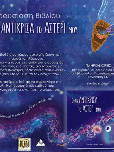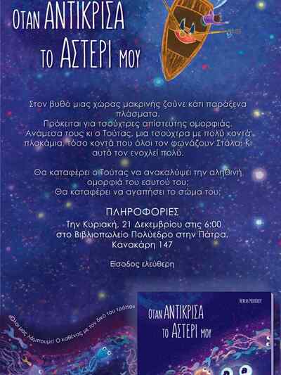 Μία Διαδραστική παρουσίαση του παιδικού βιβλίου «Όταν αντίκρισα το αστέρι μου» της Νεφέλης Μοσχόβου, θα γίνει την Κυριακή 21 Δεκεμβρίου 2025, στις 6 το απόγευμα, στο Πολύεδρο, στην Κανακάρη 147 στην Πάτρα. Ένα βιβλίο για να αγαπάμε το σώμα μας και να πιστεύουμε στον εαυτό μας.