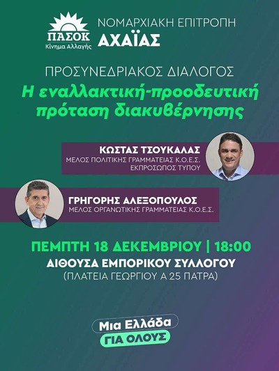Στις 18:00 το απόγευμα της Πέμπτης στην Αίθουσα του Εμπορικού Συλλόγου Πατρων ο Κώστας Τσουκαλάς & ο Γρηγόρης Αλεξοπουλος θα πραγματοποιήσουν τις κεντρικές εισηγήσεις σε πολιτικό και οργανωτικό επίπεδο.