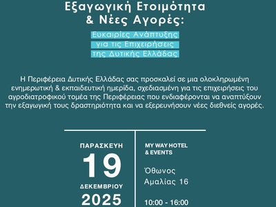 Μια ολοκληρωμένη ενημερωτική και εκπαιδευτική Ημερίδα με τίτλο «Εξαγωγική Ετοιμότητα & Νέες Αγορές: Ευκαιρίες Ανάπτυξης για τις Επιχειρήσεις της Δυτικής Ελλάδας» διοργανώνει η Περιφέρεια Δυτικής Ελλάδας, με στόχο την ενίσχυση της εξωστρέφειας και της διεθνούς παρουσίας των επιχειρήσεων της περιοχής.