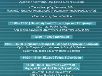 Η Ημερίδα απευθύνεται σε επιχειρήσεις του αγροδιατροφικού τομέα της Περιφέρειας Δυτικής Ελλάδας που ενδιαφέρονται να αναπτύξουν την εξαγωγική τους δραστηριότητα και να εξερευνήσουν νέες διεθνείς αγορές.