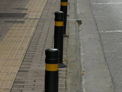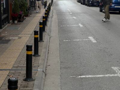 Η απορία μας είχε να κάνει με το γεγονός πως τα κολωνάκια με τα φωσφορίζοντα στοιχεία πάνω τους, δεν θα μπορούσαν να αντέξουν την πρόσκρουση με όχημα, όντας πακτωμένα πάνω σε κυβόλιθους με απλές βίδες. Όμως αποδείχθηκε πως κυριολεκτικά είναι "διακοσμητικά" και πάνω από όλα αποτρεπτικά ώστε κανείς να σταθμεύσει "ελαφρώς" το όχημά του πάνω στο πεζοδρόμιο. Τα κολωνάκια είναι χρώματος μεταλικού μαύρου και μοιάζουν στιβαρά ωστόσο είναι... πλαστικά!
