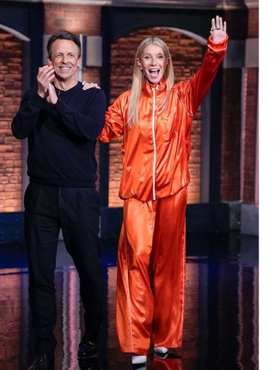 Eπιπλέον, την είδαμε με πορτοκαλί σύνολο αθλητικής φόρμας, ένα zip-up jacket και ασορτί παντελόνι με αδιάβροχη, αντιανεμική υφή. Ως τολμηρή και επιδραστική expert της μόδας τα συνδύασε με λευκές γόβες επιτυγχάνοντας ένα statement outfit. Το σύνολο ήταν από τη συλλογή Lacoste spring 2026. Η εταιρεία έχει κάνει σήμα κατατεθέν της το πορτοκαλί με τη σφραγίδα της 52χρονης Ελληνοαμερικανίδας σχεδιάστριας Pelagia Kolotouros. Πρώην δημιουργικό στέλεχος σε Adidas, The North Face, Yeezy στοχεύει να «ανεβάσει» το athleisure στην καθημερινή ένδυση. (Ambassador είναι ο Νόβακ Τζόκοβιτς). Η Γκουίνεθ ανέδειξε τη δημιουργία της Pelagia στην εκπομπή «Late Night With Seth Meyers», παρά τις πολύ χαμηλές θερμοκρασίες στη Νέα Υόρκη.
