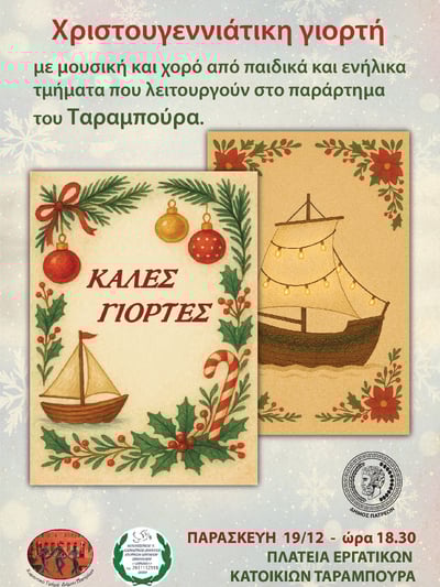Οι Χριστουγεννιάτικες δράσεις του δήμου της Πάτρας συνεχίζονται στις 6.30 το απόγευμα την Παρασκευή 19 Δεκεμβρίου στην πλατεία των Εργατικών κατοικιών Ταραμπούρα με την γιορτή του Χορευτικού Τμήματος .