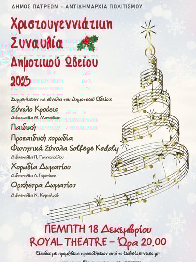 Οι εκδηλώσεις που διοργανώνει ο δήμος της Πάτρας για τον εορτασμό των Χριστουγέννων και της Πρωτοχρονιάς, συνεχίζονται στις 8.00 το βράδυ της Πέμπτης 18 Δεκεμβρίου στο χώρο του Royal (Ακτή Δυμαίων 51), με το Χριστουγεννιάτικο Κοντσέρτο των μουσικών συνόλων του Δημοτικού Ωδείου Πατρών.