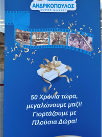 Με την ολοκλήρωση της επετειακής χρονιάς για τα 50 χρόνια λειτουργίας τους, τα Σούπερ Μάρκετ Ανδρικόπουλος ευχαριστούν όλους όσοι γιόρτασαν μαζί τους αυτή τη σημαντική διαδρομή. Τους πελάτες, τους συνεργάτες και τους προμηθευτές τους, που με την εμπιστοσύνη, τη συνεργασία και τη διαχρονική τους στήριξη συνέβαλαν ουσιαστικά στη διαμόρφωση και τη συνεχή εξέλιξη της επιχείρησης.
