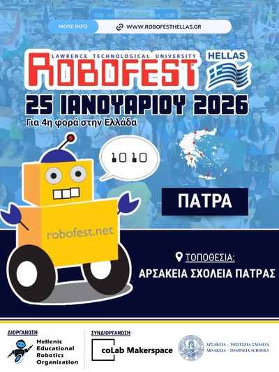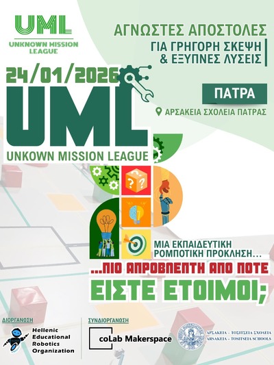 Ένα διήμερο φεστιβάλ ρομποτικής έρχεται στην Πάτρα! Το εκπαιδευτικό κέντρο τεχνολογίας και καινοτομίας coLab Makerspace, σε συνεργασία με τα Αρσάκεια Σχολεία Πατρών, αναλαμβάνουν για την Δυτική Ελλάδα την διοργάνωση δύο κορυφαίων διαγωνισμών εκπαιδευτικής ρομποτικής που έρχονται στην Ελλάδα από τον Ελληνικό Οργανισμό Εκπαιδευτικής Ρομποτικής (HERO). Τον «Unknown Mission League (UML)» και τον «Robofest Hellas».