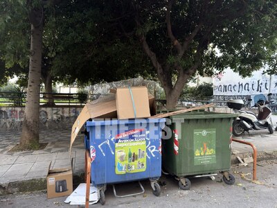 Οι μπλέ κάδοι ξεχειλισμένοι απορρίμματα, οι πράσινοι καθαροί, είναι το επαναλαμβανόμενο μοτίβο που συναντά κανείς στην Πάτρα.