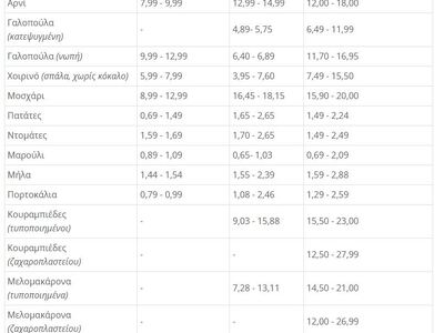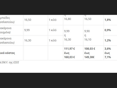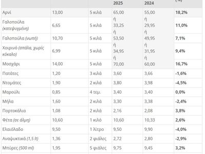 Πρόκειται για μεταβολή της τάξης του 3,6% έως 7,1% σε σύγκριση με το αντίστοιχο τραπέζι του 2024. Το εύρος των τιμών δικαιολογείται από την καταγραφή σειράς προϊόντων διαφορετικής ποιότητας, σε αρκετές τοπικές αγορές και διαφορετικούς τύπους καταστημάτων. Επιπρόσθετα, διευκρινίζεται ότι οι τιμές των προϊόντων που εμφανίζονται στους Πίνακες (1 & 2) είναι ενδεικτικές και επιχειρούν να χαρτογραφήσουν τη γενική διάρθρωση τιμών και την εικόνα της αγοράς (βλ. μεθοδολογικό σημείωμα).