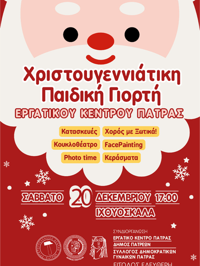 Η Χριστουγεννιάτικη γιορτή για παιδιά που διοργανώνει ο δήμος της Πάτρας σε συνεργασία με το Εργατικό Κέντρο Πάτρας και τον Σύλλογο Δημοκρατικών Γυναικών Πάτρας, οι Εικαστικές Κατασκευές, οι παραστάσεις θεάτρου Σκιών και οι προβολές ταινιών κυριαρχούν στις εκδηλώσεις του Σαββάτου 20, Κυριακής 21 και Δευτέρας 22 Δεκεμβρίου, που διοργανώνει ο Δήμος για τα Χριστούγεννα και την Πρωτοχρονιά.