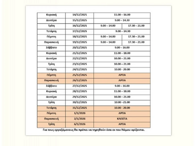 Σε ισχύ βρίσκεται το εορταστικό ωράριο καθώς τα Χριστούγεννα και η Πρωτοχρονιά πλησιάζουν.