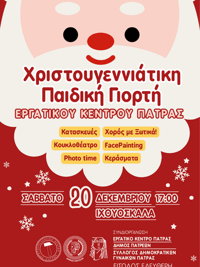 Το Εργατικό Κέντρο Πάτρας, σε συνδιοργάνωση με τον Δήμο Πατρέων και τον Σύλλογο Δημοκρατικών Γυναικών Πάτρας, προσκαλεί όλα τα μικρά παιδιά των μελών των πρωτοβάθμιων σωματείων του, τα παιδιά των εργαζομένων και των λαϊκών οικογενειών της πόλης μας, στη μεγάλη Χριστουγεννιάτικη Παιδική Γιορτή, το Σάββατο 20 Δεκεμβρίου στις 17:00, στην Ιχθυόσκαλα.