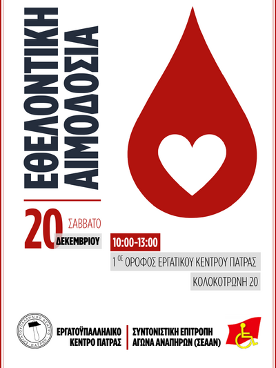 Το Εργατικό Κέντρο Πάτρας και η Συντονιστική Επιτροπή Αγώνα Αναπήρων (ΣΕΑΑΝ) καλούν όλους τους εργαζόμενους, τους νέους, τους γονείς και κάθε άνθρωπο με διάθεση προσφοράς, σε εθελοντική αιμοδοσία το Σάββατο 20 Δεκεμβρίου 2025, 10:00 - 13:00, στον 1ο όροφο του Εργατικού Κέντρου Πάτρας στην οδό Κολοκοτρώνη.