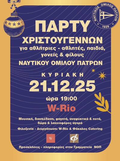 Στις 21 Δεκεμβρίου, ο Ναυτικός Όμιλος Πατρών διοργανώνει χριστουγεννιάτικη εκδήλωση στον χώρο του W-Rio, στην παραλία του Ρίου. Η εκδήλωση περιλαμβάνει μουσική, φαγητό, δρώμενα και λαχειοφόρο αγορά με δώρα από χορηγούς, και απευθύνεται σε μέλη, αθλητές, τις οικογένειες και τους φίλους του Ομίλου.