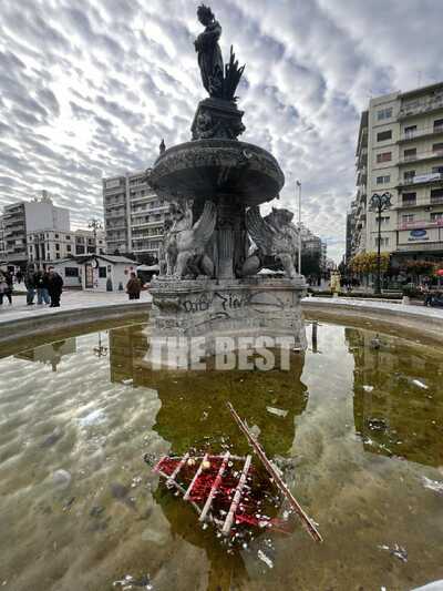 Ένα χριστουγεννιάτικο δέντρο βρίσκεται πεταμένο μέσα στο συντριβάνι της πλατείας Γεωργίου στην Πάτρα.