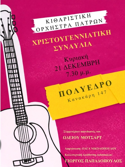 Γνωστό έγινε το Πρόγραμμα Χριστουγεννιάτικης Συναυλίας Κιθαριστικής Ορχήστρας Πατρών που θα πραγματοποιηθεί στο Πολύεδρο.