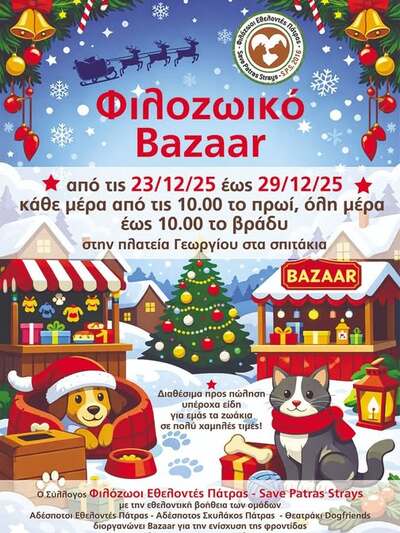 Φιλοζωικό bazaar διοργανώνεται στην πλατεία Γεωργίου της Πάτρας από την Τρίτη 23 έως και τη Δευτέρα 29 Δεκεμβρίου 2025.