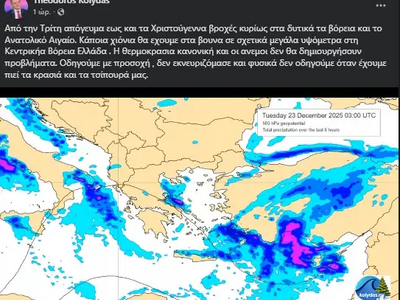 «Με μουντό, βροχερό καιρό και λίγα χιόνια τα φετινά Χριστούγεννα. Καλημέρα και καλή εβδομάδα! Με αρκετές βροχές οδεύουμε προς τα Χριστούγεννα. Οι περισσότερες βροχές το τριήμερο Τρίτη – Πέμπτη θα εκδηλωθούν στα δυτικά – βόρεια – ανατολικό Αιγαίο – Δωδεκάνησα (καιρός τύπου -Π-). Τα χιόνια θα πέσουν στα ορεινά και στα χιονοδρομικά. Η θερμοκρασία θα γίνει λίγο πιο χειμωνιάτικη. Από την Παρασκευή και το Σ/Κ βελτιώνεται ο καιρός. Φινάλε το 2025 θα κάνει με περισσότερο κρύο και ίσως και χιονο-εκπλήξεις! Ακολουθεί η συσσώρευση υετού το επόμενο τριήμερο και ο καιρός σε 10 Χριστουγεννιάτικους προορισμούς. Καλά Χριστούγεννα!»