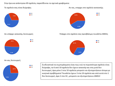 Στην έρευνα απάντησαν 69 σχολεία. Συνδυαστικά τα συμπεράσματα είναι πως ενώ τα περισσότερα σχολεία είναι διώροφα, 6 από τα 10 σχολεία δεν έχουν ασανσέρ ενώ στα μισά δεν λειτουργεί, άρα μόνο 3 στα 10 σχολεία μπορούν να εξυπηρετήσουν άτομα με κινητικά προβλήματα! Τουαλέτα έχουν 3 στα 10 σχολεία και από αυτά στο 1 δεν λειτουργεί, άρα 2 στα 10 μπορούν να εξυπηρετήσουν ΑΜΕΑ!