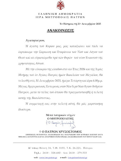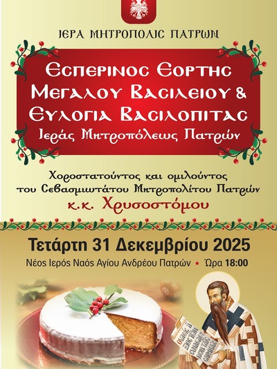 Από την Ιερά Μητρόπολη Πατρών ανακοινώθηκε πως την Τετάρτη 31 Δεκεμβρίου 2025 στις 18.00 θα τελεστεί ο Μέγας αρχιερατικός Εσπερινός της Εορτής του Μεγάλου Βασιλείου στο νέο Ιερό Ναό του Αγίου Ανδρέου και στο τέλος θα γίνει η τελετή Ευλογίας της Βασιλόπιτας της Μητροπόλεως.