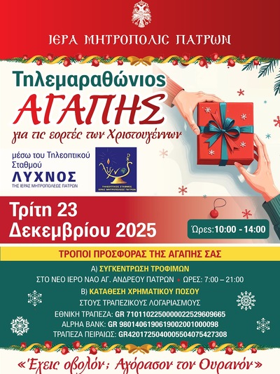 Τέλος να προσθέσουμε πως την Τρίτη 23/12 ήταν προγραμματισμένος και έγινε 10 το πρωί με 2 το μεσημέρι ο Τηλεμαραθώνιος Αγάπης της Ιεράς Μητροπόλεως Πατρών για τις άγιες ημέρες των Χριστουγέννων και της Πρωτοχρονιάς, μέσω του Τηλεοπτικού σταθμού Λύχνος.