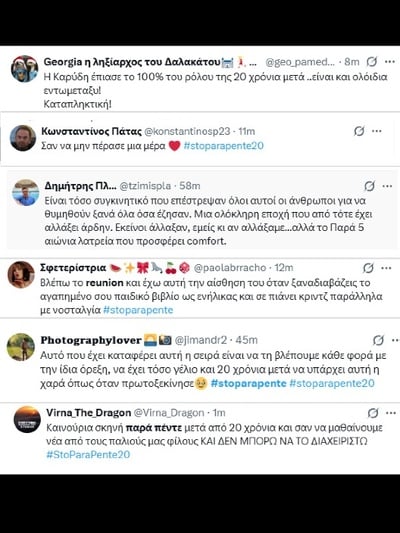 «Τα νιάτα μας», «Σαν να μην πέρασε μια μέρα», «Σαν ψέμα μου φαίνεται», «Πόσο συγκινητικό να τους βλέπουμε ξανά μαζί», «Είναι τόσο συγκινητικό που επέστρεψαν όλοι αυτοί οι άνθρωποι για να θυμηθούν ξανά όλα όσα έζησαν. Μια ολόκληρη εποχή που από τότε έχει αλλάξει άρδην», «Τι συγκινητικό παιδιά μετά από 20 χρόνια που σας ξανά βλέπουμε. Μας λείψατε τι γέλιο τι κλάμα έχουμε ρίξει μαζί σας η καλύτερη σειρά που έπαιξε ποτέ», ήταν μερικά μόνο από τα σχόλια.