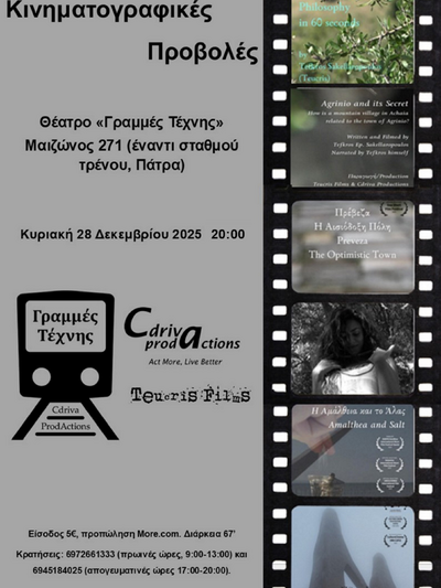 Η Cdriva ProdActions και η Teucris Films, προβάλλουν έξι (6) βραβευμένες ταινίες μικρού και μεσαίου μήκους του Τεύκρου Σακελλαρόπουλου στον Πολυχώρο Πολιτισμού - Θέατρο Γραμμές Τέχνης (στην οδό Μαιζώνος 271, έναντι σταθμού τρένου) στην Πάτρα, την Κυριακή 28 Δεκεμβρίου 2025 στις 8 μμ.