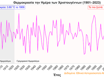 Η 25η Δεκεμβρίου 1909 ήταν η πιο κρύα μέρα Χριστουγέννων, σύμφωνα με τις καταγραφές του ιστορικού κλιματικού σταθμού του Εθνικού Αστεροσκοπείου Αθηνών (ΕΑΑ) που βρίσκεται μόνιμα εγκατεστημένος στο λόφο των Νυμφών στο Θησείο και παρέχει πολύτιμες πληροφορίες για τον καιρό της Αθήνας αδιάλειπτα από το 1890.