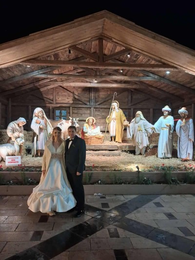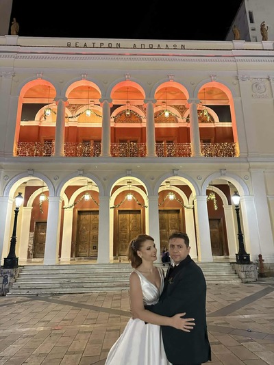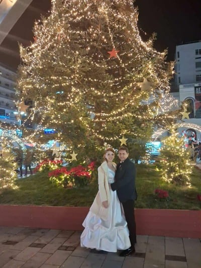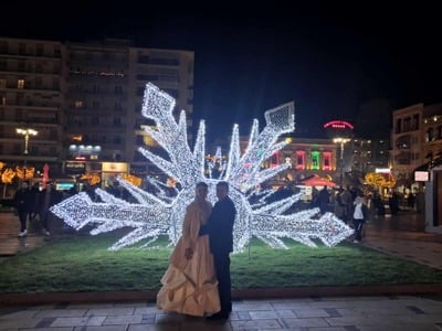 Μετά το μυστήριο, οι νεόνυμφοι πραγματοποίησαν φωτογράφιση στην εορταστικά στολισμένη πλατεία Γεωργίου της Πάτρας, με φόντο τον χριστουγεννιάτικο διάκοσμο της πόλης, ολοκληρώνοντας τη μέρα με όμορφες στιγμές και χαμόγελα.